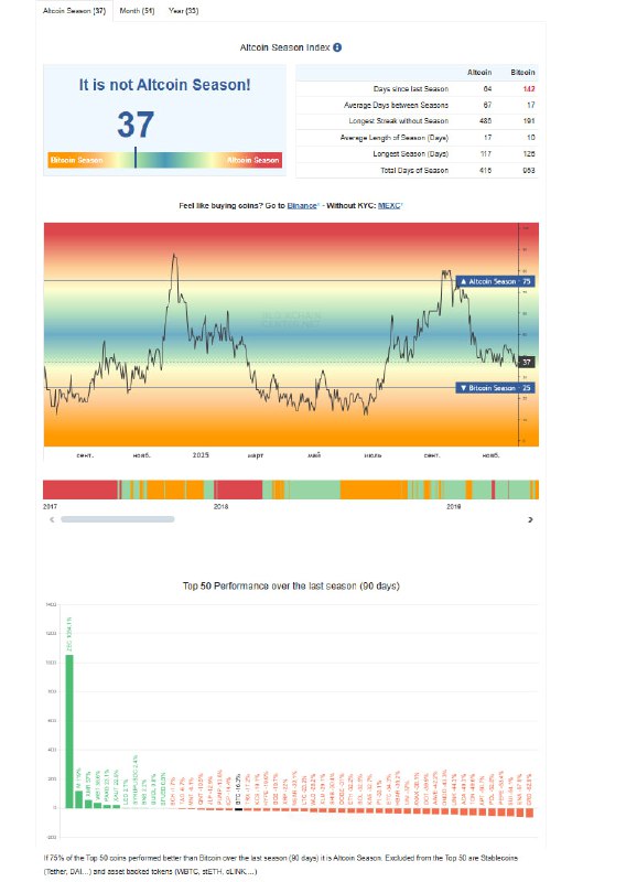 The widely tracked Altcoin Season Index currently reads 37, indicating it is not altcoin season. Over the past 90 days, only 60% of the top 50 cryptocurrencies outperformed Bitcoin, below the 75% threshold needed to confirm an altcoin season. It has been 127 days since the last altcoin season, with the historical average gap at 197 days.