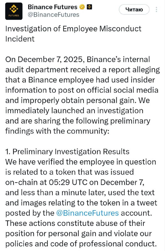- On December 7, Binance received reports that an employee had advance knowledge of a planned post from the official