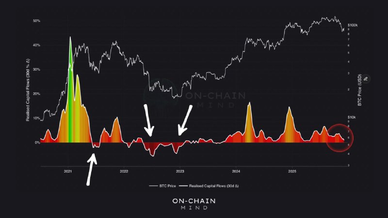 Realized capital flows are an on-chain metric that tracks the net movement of realized value into and out of Bitcoin. Unlike simple price analysis, this indicator ties capital flows to on-chain transaction values, offering a clearer picture of whether new money is entering or exiting the network over time.