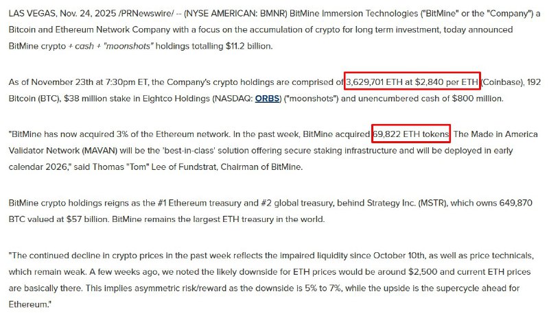 BitMine purchased 69,822 ETH last week for approximately $196.79 million, boosting its total holdings to 3,629,701 ETH valued at about $10.2 billion. The company now controls roughly 3% of the circulating Ethereum supply as it accelerates its accumulation strategy.