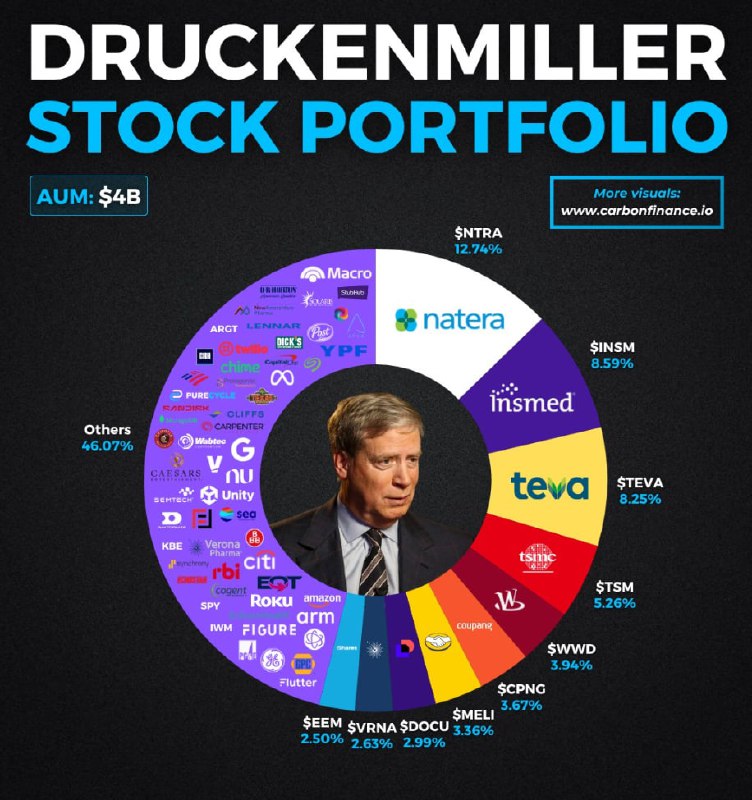 Stanley Druckenmiller’s latest disclosed equity portfolio totals approximately $4 billion, with a notable tilt toward biotech and pharmaceuticals. The largest position is Natera (NTRA) at 12.74%, followed by Insmed (INSM) at 8.59%, Teva Pharmaceuticals (TEVA) at 8.25%, and Uber Technologies (UBER) at 5.94%. The portfolio’s “Others” category accounts for 46.07%, highlighting broad diversification beyond the top names.