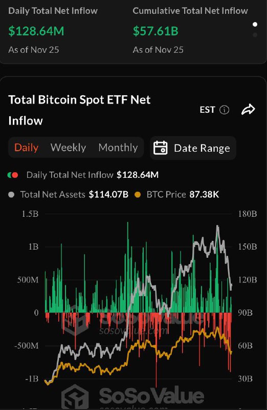 - Bitcoin (BTC) spot ETFs: about $128 million in net inflows
