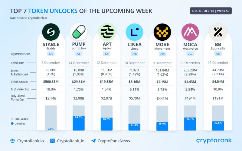 Seven crypto tokens are set to unlock a combined $639.65 million in the week of December 8–14 (Week 50), with STABLE accounting for the lion’s share at $566.38 million. Data indicates sizable unlock events across several altcoins, including PUMP, BB, and MOCA, which could influence short-term market liquidity and price action.