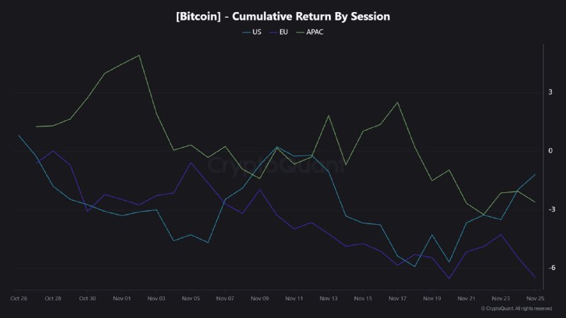 - A chart titled “Bitcoin — Cumulative Return By Session” tracks performance across US, EU, and APAC sessions from Oct 25 to Nov 26.